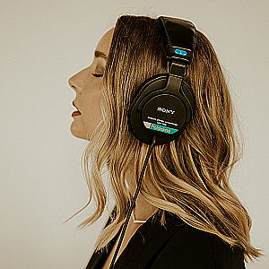 Focusrite Scarlett 2i2 (3rd Gen.) USB audio interface; Sony MDR-7506 professional stereo headphones; acoustic paneling