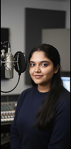 Acoustically treated home recording space and high-sensitivity mobile condenser microphone for noise-free output.